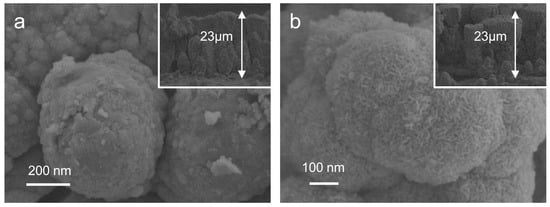 SEM images of (a) NiMo/NiMoCx and (b) NiFeMo/NiFeMoCx. Inset: a cross-section image.