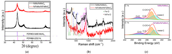 Figure 2a shows the X-ray powder diffraction (XRD) patterns of NiMo/NiMoCx and NiFeMo/NiFeMoCx. Strong peaks near 43.5°, 51°, and 74.5° were observed for both samples and were attributed to the nickel alloy having a face-centered cubic structure. These three peaks were shifted to lower angles compared to the standard patterns of pure nickel, which was caused by lattice expansion that resulted from the doping of larger atoms (Mo and Fe). The diffraction peaks for NiFeMo/NiFeMoCx were wider than those for NiMo/NiMoCx, indicating a smaller crystal size. Other phases (oxides or carbides) were not detected in the XRD for both materials, possibly because of the small quantity or because the crystal size was below the coherence length of the X-ray [43]. According to the Raman pattern (Figure 2b), both samples exhibited TO and LO vibration peaks in the Ni-O bond at 380 and 520 cm−1, respectively. Additionally, a Ni-OH bond vibration peak was observed at 320 cm−1, indicating the presence of NiO and/or Ni(OH)2 species in the film [44,45]. The vibration peak at 906 cm−1 was attributed to symmetric stretching of the Mo-O bond, while those at 820 and 870 cm−1 were assigned to O-Mo-O bond vibrations. The peaks observed at 168, 750, and 780 cm−1 corresponded to Mo-O vibrations in MoO42−, suggesting the existence of molybdate species [46]. The appearance of peaks at 1340 and 1580 cm−1 can be attributed to the carbon’s D band and G band respectively, indicating the presence of carbides in the film. In NiFeMo/NiFeMoCx, significant numbers of vibration peaks were observed at 214, 257, 277, 405, 500 and 612 cm−1, which were assigned to the Fe-O vibrations in Fe2O3 and Fe3O4 [47]. Nickel–iron oxides were detected from the vibration peaks at 460, 540 and 690 cm−1 [48,49]. Furthermore, compared with NiMo/NiMoCx, the vibration peaks of Ni–O bond in NiFeMo/NiFeMoCx were shifted towards higher wave numbers, indicating an increased content of Ni3+ resulting from the oxidation by the solution containing Fe3+ [45,50].