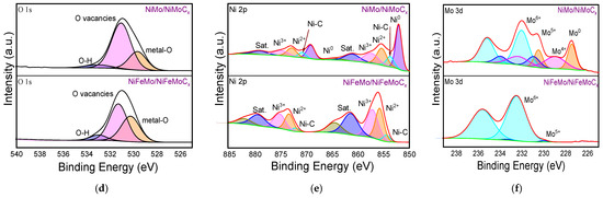 The element content of NiFeMo/NiFeMoCx after HER was essentially the same as the as-prepared sample (Table S5), confirming the robust stability of a metal/carbide hybrid under a reductive environment. After the OER, the C content was decreased, and the O content was increased slightly. This suggested that only the outmost carbide was transformed into the oxide, which prevented the further oxidation of the catalyst. XPS was conducted to investigate the change in surface state. After the HER, metal-O bonds as well as Mo 3d and Fe 2p peaks experienced a slight shift towards a lower binding energy by 0.2~0.4 eV. The proportions of lattice oxygen, Mo6+, and Fe3+ were all decreased, from 38.7, 98.81, and 62.89 to 32.17, 97.42, and 57.83%, respectively (Figure 7c–e). In the Ni 2p spectrum (Figure 7f), the Ni3+ peak was shifted towards lower binding energy by 0.14 eV, while its percentage was decreased from 51.47 to 39.48%. In comparison, the peaks’ position of metal-C bonds, Ni-C bonds, and Ni(II) remained unchanged with only a slight increase in the peak area, suggesting the high stability of carbide under reductive conditions. After the OER, metal–C and Ni-C peaks were shifted towards higher binding energies with reduced percentage. At the same time, metal–O, Ni3+, and Fe3+ peaks were shifted towards higher binding energies with increased percentage (Figure 7b–f). This further confirmed that the carbide was transformed into oxide or hydroxide during the OER, producing a highly active and stable catalyst.