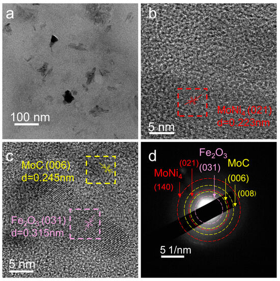 In order to gain a more comprehensive understanding of NiFeMo/NiFeMoCx, a detailed characterization was performed using transmission electron microscopy (TEM). In the high-resolution images, distinct lattice fringes were revealed with interplanar spacings of 0.223 nm, 0.245 nm, and 0.315 nm, corresponding to the (021) plane of MoNi4, the (006) plane of MoC, and the (031) plane of Fe2O3, respectively (Figure 3b,c). Selected area electron diffraction patterns (SAED) are presented in Figure 3d, illustrating well-defined diffraction rings for MoNi4, MoC, and Fe2O3. These results confirmed the existence of nickel alloy and metal carbide in NiFeMo/NiFeMoCx, along with the small amounts of oxide that resulted from the natural oxidation of metal/carbide in the atmosphere.