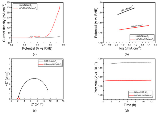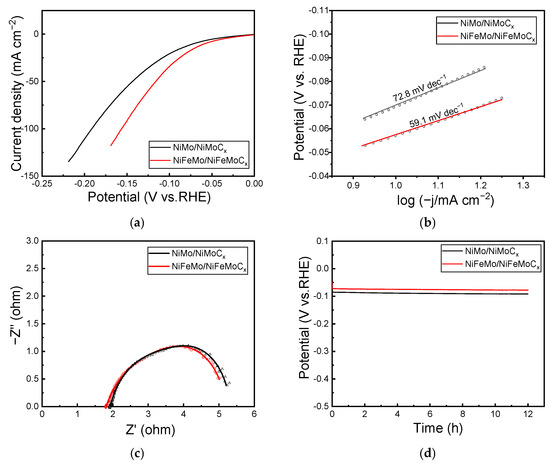 In alkaline conditions, both materials exhibited good HER activity. The η10 was 72 and 60 mV for NiMo/NiMoCx and NiFeMo/NiFeMoCx, respectively (Figure 4a). The control sample of NiFeMo was prepared via a conventional electrodeposition (without the introduction of plasma) at 2 V for 10 min in the same solution as that used for the synthesis of NiFeMo/NiFeMoCx. No active carbon species were produced during the conventional electrodeposition because of the much lower potential and/or much lower temperature (the local temperature in the solution during CPED could be >3000 K) [38]. Therefore, no carbide was formed and only NiFeMo was deposited. The η10 was 172 mV for NiFeMo (Figure S2), much higher than that of NiFeMo/NiFeMoCx (60 mV). The greatly enhanced activity of NiFeMo/NiFeMoCx might have resulted from the synergistic effect between metal and carbide, which facilitated the charge redistribution on the interface and promoted the tandem electron transfer process [54,55]. The Tafel slope provides valuable information regarding the reaction mechanism and is utilized to assess the kinetics of catalysis. The doping of iron increased the concentration of Ni3+, which exhibited a strong affinity towards water molecules and oxygen-containing intermediates. This facilitated the dissociation process of water and mitigated its hindrance of the HER. Consequently, the Tafel slope of NiFeMo/NiFeMoCx (59.1 mV dec−1) was lower than that of NiMo/NiMoCx (72.8 mV dec−1), as shown in Figure 4b. The accelerated dissociation of water and appropriate hydrogen binding strength enhanced the alkaline HER kinetics for NiFeMo/NiFeMoCx, leading to a higher intrinsic catalytic activity.