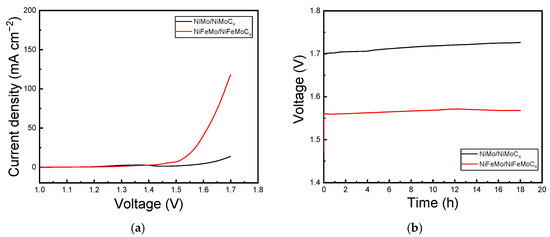 The overall water splitting voltage of NiFeMo/NiFeMoCx was only 1.52 V at 10 mA cm−2, and outperformed that of NiMo/NiMoCx (1.67 V) (Figure 6a). The overpotential for overall water electrolysis on NiFeMo/NifeMoCx (0.29 V) was essentially equal to the sum of its HER overpotential (0.06 V) and OER overpotential (0.23 V), suggesting no cross-contamination between the cathode and anode materials. Cross-contamination leads to catalyst poisoning and is a common issue in the overall water splitting system using different electrocatalysts for the HER and OER. Subsequently, the stability was tested for these two samples (Figure 6b). There was only a 14 mV change in the overpotential for NiFeMo/NiFeMoCx after 18 h. It is, therefore, a promising transition-metal-based electrocatalyst for overall water splitting. The overall water splitting activity of NiFeMo/NiFeMoCx (1.52 V at 10 mA cm−2) was comparable or superior to that of recently reported advanced catalysts, such as Mn–W–CoP/NF (1.57 V), FeN0.023/Mo2C/C (1.55 V), FeS2/Fe–Ni3S2 (1.5 V), and RuO2-Co3O4 (1.54 V, Table S4) [60,61,62,63].