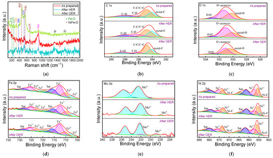 To gain deeper insight into the improved stability of NiFeMo/NiFeMoCx, Raman spectroscopy was conducted on the as-prepared samples as well as those subjected to 18 h of HER/OER testing (Figure 7a). Although a slight shift towards a lower wave number was noticed in the vibration peak of NiFeO, there was little change in the vibration peaks of Ni-O and Ni-OH after the HER. During hydrogen evolution, nickel–iron oxides were more easily reduced than NiO or Ni(OH)2 [64]. Therefore, the stability of NiO/Ni(OH)2 was improved due to the sacrificing effect of NiFeO. Additionally, molybdates and molybdenum oxide were gradually dissolved under alkaline conditions, leading to a decrease in the peak intensity near 906 cm−1, which was associated with Mo-O vibration. The D peak and G peak of carbon were well reserved, suggesting the good stability of metal carbide even under the strong reductive environment rich in hydrogen atoms. After OER, the peaks in the NiFe-O bond vibrations at 460 and 546 cm−1 exhibited a significant increase and were redshifted to 471 and 549 cm−1, respectively. Meanwhile, the intensities of both the D peak and G peak of carbon were decreased. This was attributed to the oxidation of the NiFe alloy and carbide by (Ni, Fe)OOH during the prolonged OER process. It is worth noting that (Ni, Fe)OOH not only exhibits excellent stability under oxidative conditions, but also demonstrates an exceptional intrinsic catalytic activity as an OER catalyst [37,65]. Therefore, the OER activity of NiFeMo/NiFeMoCx was maintained during the stability test.