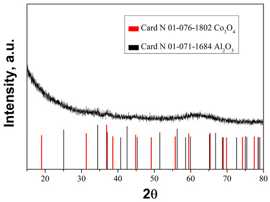 The XRD pattern (Figure 5) of the fresh sample after calcination at 500·°C revealed broad and low intensive peaks associated with Co3O4 and Al2O3, indicating the formation of finely divided oxide phases. Very likely the synthesized layer of Al2O3 is a highly disordered one and/or there is an amorphous Al-oxide compound [36]. The XRD patterns for palladium and palladium oxide were not detected in the catalyst, revealing finely divided phases. This claim is further supported in the article with TEM data.