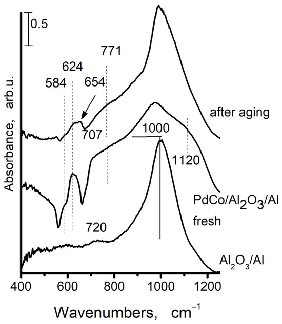 A broad band, centered at 1000 cm−1 is visible in the anodic alumina support. It is indicative of no uniformity in the coordination surroundings of Al in the amorphous aluminum oxide [38]. The presence of amorphous aluminum is confirmed by XRD data. Some low-intensity absorption peaks at 720 cm−1 are also observed, and these could be attributed to the ν-AlOH [39]. The bands at 584 cm−1, 624 cm−1, and 654 cm−1 are appearing in infrared spectra after deposition of cobalt and palladium and after aging. The bands for both cobalt oxide and alumina are observed within this region, which makes the assignment very difficult.