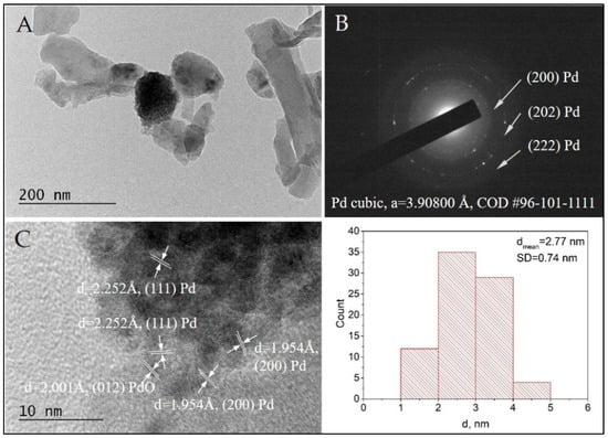 TEM observations of the morphology and microstructure of sample Pd/AAS were performed for a comparative study. The SAED analysis confirmed the formation of cubic Pd (COD Entry #96-101-1111) (Figure 9B). Additionally, the HRTEM imaging showed the co-existance of Pd (COD Entry #96-101-1111) and tetragonal PdO (COD Entry #96-100-9032) (Figure 9C,D). The presence of PdO in the Pd+Co/AAS sample was confirmed by XPS analysis. In our previous investigation, we suggested that the role of the surface cobalt oxide phase is to stabilize the palladium in its oxidized state and to serve as a reservoir of the oxygen species [27]. Direct evidence for this statement can be seen in Figure 8C, where the PdO particle is seen to be surrounded by cobalt oxide particles, and the cobalt particle in direct contact with the PdO has been reduced to metallic cobalt (Figure 8C).