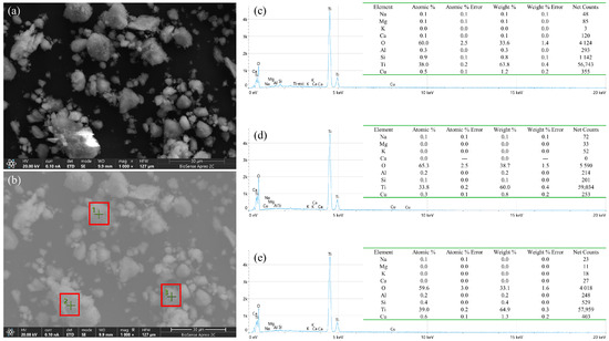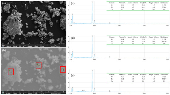 The HR SEM analysis of Cu-TiO2 powder: (a) SEM image, (b) EDX image, (c) EDX point 1, (d) EDX point 2, and (e) EDX point 3.