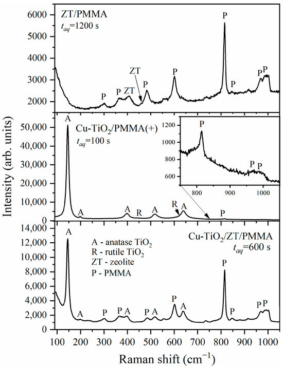The Raman spectra of PMMA polymer tablets covered with ZT, Cu-TiO2 powder, and their combination are presented in Figure 7. In the spectra of tablets with Cu-TiO2 coverage, very intensive anatase modes are registered, with an unchanged position and line-width compared with starting Cu-TiO2 powder (Figure 5). The modes ascribed to PMMA are clearly resolved in the spectra of the samples ZT/PMMA and Cu-TiO2/ZT/PMMA. However, these modes are hardly noticeable in the spectrum of Cu-TiO2/PMMA(+) because the entire surface of the tablet is covered with Cu-TiO2 powder, and highly intensive anatase Raman modes overpower those from the PMMA polymer. The modes of ZT are recognizable only in the spectrum of ZT/PMMA, whereas in the spectrum of Cu-TiO2/ZT/PMMA they are covered by much more intensive modes of anatase and PMMA. Note also that the acquisition time (denoted by taq in figures) of spectra collected at investigated samples varies from 50 to 1200 s because of the significant difference in the intensity of the strongest Raman modes in anatase, PMMA, and ZT.
