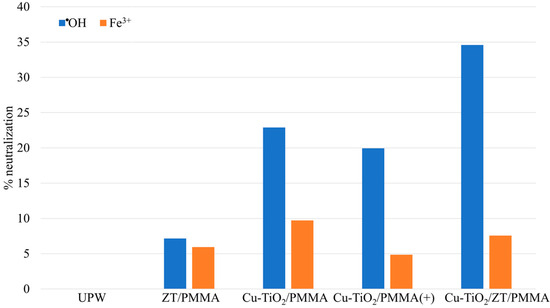 Neutralization of Fe3+ occurs in the case of all synthesized materials. This indicates that all materials can bind Fe3+ ions when present in water, which contributes to more efficient photocatalytic activity because Fe3+ ions tend to capture the electrons of the catalyst, thus slowing down the recombination of electrons and holes [27]. ZT/PMMA and Cu-TiO2/PMMA(+) show the lowest neutralization of Fe3+ ions, which is in accordance with the results of photocatalysis of dyes. ZT is not a photocatalytically active material, while with Cu-TiO2/PMMA(+) a greater aggregation of particles was observed (Figure 4b), which hindered the binding of Fe3+ ions to the surface. The neutralization results of F3+ ions by Cu-TiO2/PMMA and Cu-TiO2/ZT/PMMA were similar, with Cu-TiO2/PMMA being slightly more effective, which fully follows the concept of dye removal.