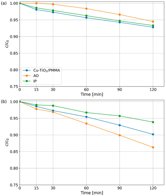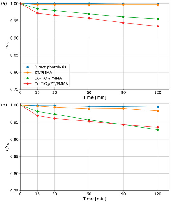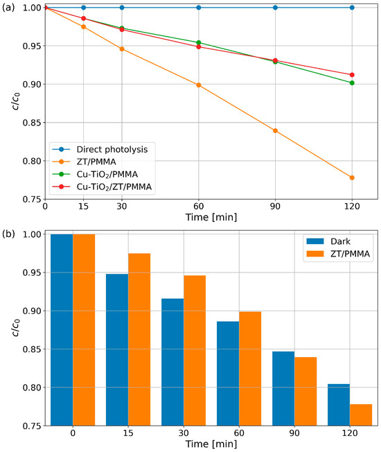 MB was photolytically stable under SS irradiation (Figure 10a), while in the presence of ZT/PMMA, 22.2% of MB was removed from the solution. After the dye removal experiment, the ZT/PMMA tablet turned blue, referring to the possibility of dye absorption and not its photocatalytic degradation. This was confirmed by MB removal in the presence of ZT/PMMA tablets in the dark (Figure 10b), which achieved the same removal efficiency as in the presence of irradiation. This can be explained by the fact that MB is a cationic dye [28], while the zeta potential of ZT at the natural pH value is negative [29]. This means that MB is electrostatically binding to the ZT surface, which was not the case with MO because it is an anionic dye [30]. With the use of Cu-TiO2/PMMA and Cu-TiO2/ZT/PMMA, the degradation efficiency of MB was 9.8% and 8.8%, respectively.