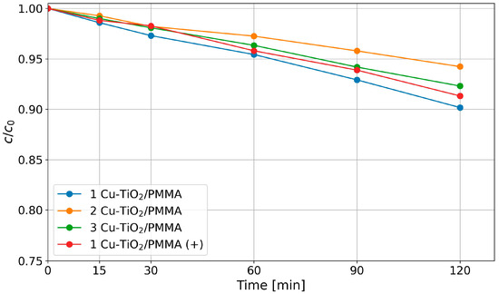 Given the higher efficiency in the degradation of MB, the compound was further investigated. Cu-TiO2/PMMA proved to be the most effective in removing MB from UPW under SS radiation. Therefore, the influence of the number of Cu-TiO2/PMMA tablets, as well as the coverage of Cu-TiO2 material on the PMMA polymer, was examined (Figure 11). Photocatalysis with 1 Cu-TiO2/PMMA, 2 Cu-TiO2/PMMA, and 3 Cu-TiO2/PMMA tablets degraded 9.8%, 5.8%, and 7.7% of MB, respectively, under SS irradiation. Based on the results, using one tablet was the most effective, while in the presence of two tablets, the percentage of MB degradation was the lowest. By mixing more tablets in the solution, the tablets may occasionally overlap, preventing light from reaching the entire surface of all the tablets, thus reducing the photocatalytic efficiency. The increased coverage of Cu-TiO2 material on the PMMA polymer did not prove to be more effective because 8.7% was degraded, possibly due to the formation of larger aggregates on the PMMA surface (Figure 4b). The aggregation of photocatalyst particles reduced the contact surface between MB and Cu-TiO2/PMMA(+), which negatively affected the photocatalytic efficiency. The effectiveness of the tablet with lower coverage may be due to an optimal balance between light penetration and active surface area, preventing excessive aggregation of Cu-TiO2 particles, which can sometimes hinder photocatalytic efficiency.