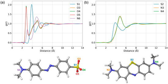 Representative RDFs of (a) MO and (b) MB dyes and their enumerated molecular structures.