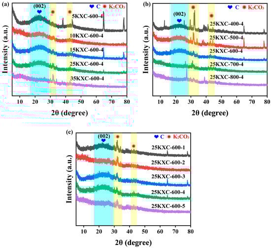 The XRD patterns of the KXC catalysts are shown in Figure 2. The XRD patterns of the catalysts synthesized at varying K2CO3 loadings, activation temperatures, and activation times are available in Figure 2a–c. These patterns show a broad band between 2θ = 20–30°, corresponding to a (002) plane, indicating the amorphous structure. K2CO3 shows well-established crystalline peaks at 2θ = 32.6°and 42.8°, which are convenient with the JCPDs card: (01-070-0292). This confirms the successful coverage of K2CO3 on KXC [,,].