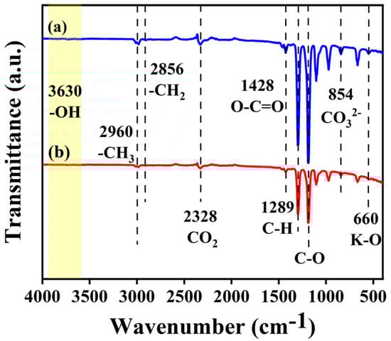 The infrared spectra of the KXC and 25KXC-600-4 catalysts are shown in Figure 4 and reveal the catalysts’ functional groups. The FT-IR spectrum of KXC displays a wide band, as observed at 3650 cm−1 []. The assignment corresponds to the O-H stretching of hydroxyl groups found in cellulose and hemicellulose. The peaks at 2960 cm−1 and 2856 cm−1 result from changes in the methyl and methylene groups []. The absorption peak at 2960 cm−1 is caused by the symmetric stretching vibration of CO2. The CO2 adsorbed on the catalyst reacts with the basic substances on the surface. The presence of CO32− at 854 cm−1 indicates the formation of metal oxides or carbonates and this result agreed well with that of XRD [,,,].