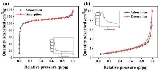 The isotherms for N2 adsorption and desorption, along with the related pore size distribution of the KXC and 25KXC-600-4 catalysts, are shown in Figure 5. The specific surface area and average pore size of the catalyst modified by K2CO3 were 3.81 m2/g and 12.329 nm, while the specific surface area and average pore size of KXC were 324.38 m2/g and 2.12 nm. The Brunauer–Deming–Deming–Teller classification indicates that the 25KXC-600-4 catalysts possess a mesoporous structure [,]. The slit-shaped pores on the surface of the catalyst are opened by calcination, resulting in a wider pore size, which creates the necessary conditions for the transesterification reaction. It has been reported that when the dimension of triglyceride and glycerin molecules is 2.5 nm, the catalyst can realize the free transport of the product []. The decrease in the specific surface area of the 25KXC-600-4 catalyst may be due to the loading of K2CO3 covering the surface of the KXC support, and the previous SEM-EDS can also confirm this result [].