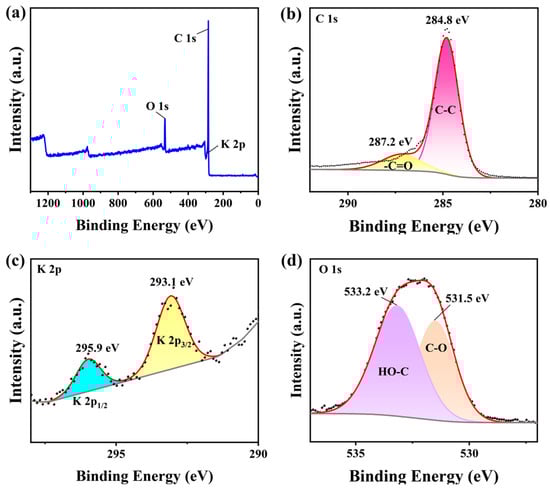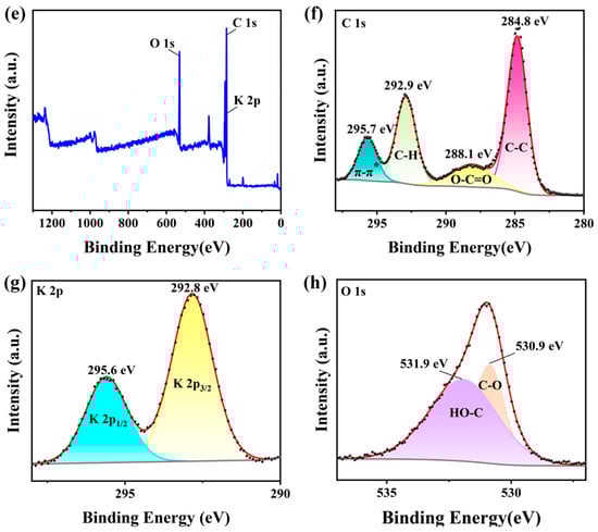 Figure 7 illustrates the oxidation states and characterizes the surface chemical composition of the KXC and 25KXC-600-4 catalyst. The main elements of C, O, and K were investigated. The overall survey XPS spectra of the KXC and 25KXC-600-4 catalysts are shown in Figure 7a,e. According to the C 1s XPS spectrum in Figure 7b, there were two different peaks centered at 284.8 eV and 287.2 eV, corresponding to C-C and -C=O groups, respectively. In Figure 7f, two peaks at 292.9 eV and 295.7 eV in the XPS spectrum of C 1s were related to C-H groups and π-π*. In Figure 7c,g, the peaks at 293.1 eV and 295.9 eV are shifted to 292.8 eV and 295.6 eV. This positive shift indicates the electronic effect between K2CO3 and KXC, resulting in an increase in the basicity of the 25KXC-600-4 catalyst []. The XPS of the O 1s of the 25KXC-600-4 catalyst is shown in Figure 7h. The spectra of O 1s of the 25KXC-600-4 catalyst display two distinct peaks at 530.9 eV and 531.9 eV. The peak at 531.9 eV is referred to as the carbonate group [], while the peak at 531.82 eV is associated with the -OH group in H2O molecules which can be attached to the catalyst surface [,].