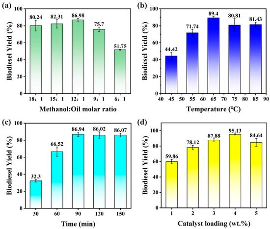 Effect of process variables on biodiesel yield. (a) Methanol–oil molar ratio; (b) temperature; (c) time; (d) catalyst loading.