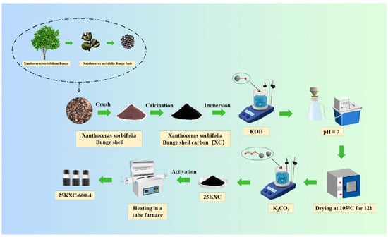 The Xanthoceras sorbifolia bunge shells were initially cleaned by washing with distilled water several times to remove all impurities of sand and dust. After this, they were dried for 24 h in an oven at 60 °C. The clean and completely dry Xanthoceras sorbifolia bunge shells were then crushed and pulverized in a grinder, then sieved in a 40-mesh standard sieve. The dried Xanthoceras sorbifolia bunge shells were subsequently calcined at 600 °C for 2 h within a nitrogen atmosphere to generate the Xanthoceras sorbifolia bunge shells carbon (XC). Then, the XC was chemically activated. The suspension was filtered to recover the XC. The filtered XC was then washed multiple times with distilled water until the pH reached neutrality. Finally, the KXC that was obtained was dried overnight in an oven at 105 °C. The KXC was chemically modified by K2CO3, and the KXC was mixed with various concentrations of K2CO3 at room temperature at 800 rpm for a certain time to obtain sufficient impregnation. Next, it was placed in an oven for aging for 24 h, and then activated in a tubular furnace (Figure 13). The as-synthesized catalysts were designated as YKXC-T-t, where Y, T, and t represented the K2CO3 concentrations (wt.%), calcination temperature, and calcination time.