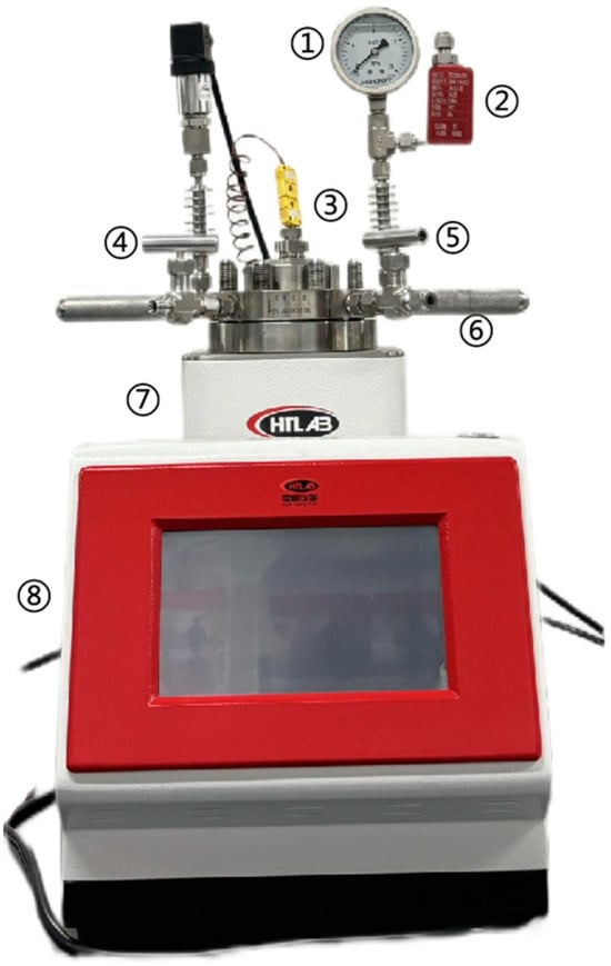 Reactor apparatus diagram. ① Pressure gauge. ② Explosion-proof film. ③ Temperature sensor. ④ Intake valve. ⑤ Relief valve. ⑥ Handle. ⑦ Heating and insulation module. ⑧ Intelligent regulation chassis.