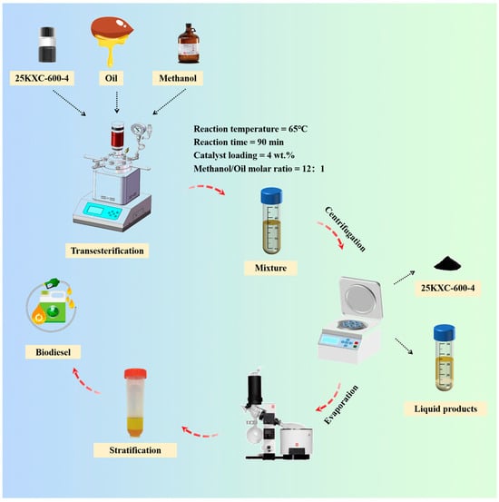 The transesterification of Xanthoceras sorbifolia bunge oil (10 g) was performed in a 50 mL reactor at a temperature of 600 rpm/min for a certain time to produce biodiesel with methanol and a KXC catalyst (Figure 14). The reactor was reduced to room temperature to obtain the mixed product. The product was centrifuged at 8000 rpm for 10 min for solid–liquid separation, and the liquid product was placed in a separation funnel for 12 h to separate the biodiesel layer and the glycerol layer. The obtained solid catalyst was washed with n-hexane and dried overnight in an oven. The biodiesel layer was finally sealed in a glass bottle containing anhydrous sodium sulfate to eliminate any remaining water (Figure 15). The biodiesel production was determined using Equation (1), where m1 stands for the weight of biodiesel produced and m2 stands for the weight of the Xanthoceras sorbifolia oil used [].
