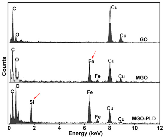 The EDS analysis of GO, MGO, and MGO-PLD.