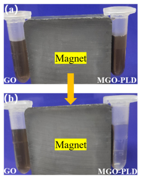 As shown in Figure 4a, the immobilized PLD can be uniformly dispersed in double-distilled water, creating a stable brown suspension. Notably, there appears to be no significant difference between GO and MGO-PLD in terms of appearance. However, upon applying an external magnetic field, MGO-PLD is drawn to the wall of the EP tube due to the magnetic properties of MGO (Figure 4b). This indicates that the magnetically immobilized enzymes were successfully synthesized. The capacity for recyclability is a defining feature of immobilized enzymes. Compared to traditional recycling methods like centrifugation or filtration, the use of an external magnetic field presents a more cost-effective and industrially viable option.