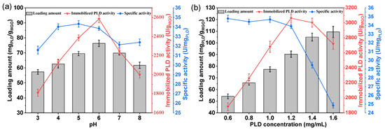 Analysis of enzyme immobilization. (a) Effect of pH on loading amount and enzyme activity; (b) effect of PLD concentration on loading amount and enzyme activity.
