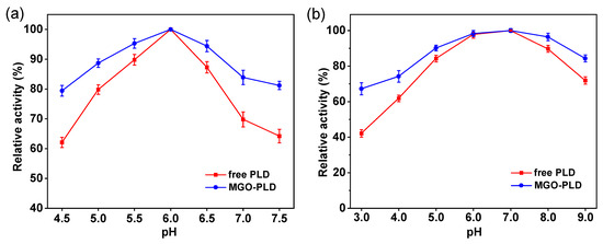 As illustrated in Figure 7a, the optimum pH for relative activity of immobilized PLD is 6.0, identical to that of free PLD. Compared to the free enzyme, the immobilized PLD shows enhanced pH tolerance over a broad range, which may be attributed to the role of MGO in the immobilized PLD system, functioning not only as a carrier but also as a “solid” buffer [35]. This phenomenon arises because the surface of MGO possesses an abundance of hydroxyl groups, which can ionize in aqueous solution and balance the nearby microenvironment’s pH, thereby serving as a buffering agent. The pH stability of both free and immobilized PLD was measured, and the results are shown in Figure 7b. The results indicate that at pH values of 6 and 7, both the free and immobilized PLD exhibit relatively high stability; however, at other pH values, the immobilized enzyme demonstrates greater robustness and minimal activity fluctuation compared to its free counterpart.