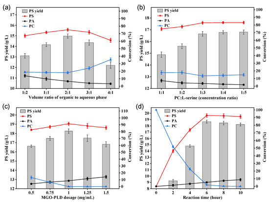 PS was synthesized from L-serine and PC by MGO-PLD in a butyl acetate aqueous system. The PC is dissolved in butyl acetate, at a concentration of 20 mg/mL, as the organic phase. L-serine is dissolved in an acetate buffer, at a concentration of 20 mg/mL, as the aqueous phase. The total volume of the reaction is 2 mL. The reaction took place at pH 6.0 at 50 °C, with stirring at 200 rpm for 10 h. Factors such as the ratio of organic to aqueous phase volumes (Vbutyl acetate:Vaqueous), substrate concentration ratio, immobilized PLD dosage (mg/mL), and reaction time were systematically evaluated for their impact on PS yield. The composition of the production after the reaction was analyzed using the method we previously reported [43]. The conversion of PS, PA, and the content of PC were calculated by Formulas (2)–(4).