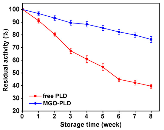 The storage stabilities of free PLD and immobilized PLD were assessed by monitoring their residual activities at various time points during storage at 4 °C.