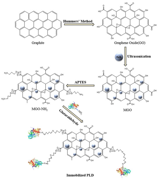 Proposed complete scheme of synthesis of MGO and immobilization of PLD.