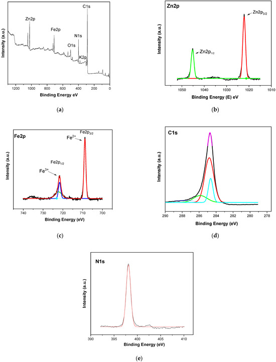X-ray photoelectron spectroscopy analysis was used to examine the surface chemical composition of the synthesized catalyst (Figure 2a). Figure 2b shows two peaks at 1021 and 1045 eV corresponding to zinc atoms (Zn2p). This indicates that zinc is present in different valence states in the form of Zn2+ in the Zn-Fe(CN)6-CNT nanocomposite. Two additional peaks were observed (Figure 2c) at 708 eV (Fe2p3/2), corresponding to the Fe2+ oxidation state, and at 721 eV (Fe2p1/2), corresponding to the Fe3+ oxidation state. However, the Zn3[Fe(CN)6]2·nH2O molecule is formed and the zinc is coordinated by cyanide and water ligands in an octahedral structure [45]. A peak was observed at 285 eV (Figure 2d) corresponding to carbon (C1s), which accounts for carbon, C–H, or C≡N. Another peak was observed at 398 eV (Figure 2e), corresponding to the absorbed nitrogen atoms (N1s), and a peak at 498 eV, corresponding to the absorbed oxygen atoms (O1s).