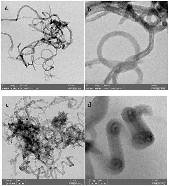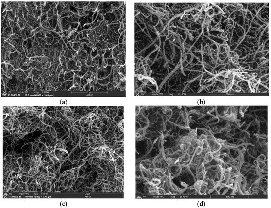 Scanning electron microscopy (SEM) and transmission electron microscopy (TEM) was performed to determine the morphology and surface structure of the catalyst. The SEM image shows a dense network of elongated thin wires, carbon nanotubes (CNTs) (Figure 3a,b). These wires are entangled with each other, forming a three-dimensional matrix. Their diameter is estimated to be between 20 and 30 nm, with a length of a few micrometers. Owing to their large electrochemically active surface area, the porous structure of CNTs can potentially absorb and distribute more catalysts [46].