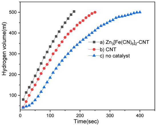 The volume of hydrogen produced as a function of time for different catalysts: (a) Zn3[Fe(CN)6]2-CNT (25 mg), (b) CNT, and (c) no catalyst.