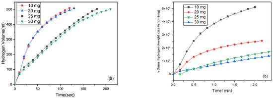 (a) Hydrogen volume variation vs. time, (b) Hydrogen volume/weight catalyst variation vs. time with different catalyst weights.