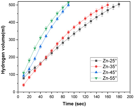 The effect of temperature on hydrogen production over time during the methanolysis reaction of NaBH4 using Zn3[Fe(CN)6]2-CNT as a catalyst was investigated. Figure 7 shows the change in the hydrogen volume as the temperature increased from 25 °C to 55 °C. As anticipated, the hydrogen generation rate (HGR) increased as the reaction temperature increased. Raising the temperature accelerates the adsorption and desorption of reactants and products on the catalyst surface. Moreover, the reaction cycles become faster, and consequently, more hydrogen is generated [53]. The hydrogen generation rate constants (K) were calculated from the curve illustrated in Figure 8. The results yielded values of 6856, 9384, 12,720, and 16,152 mL min−1 g−1 for temperatures of 25, 35, 45, and 55 °C, respectively. According to the Arrhenius equation, there is a relationship between the rate of hydrogen generation and the temperature (Equation (2))