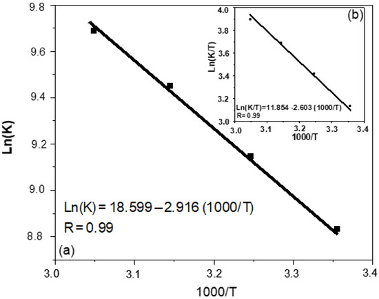 where kb is Boltzmann’s constant (1.381 × 10−23 J/K), T is the absolute temperature in Kelvin (K), h is Planck’s constant (6.626 × 10−34 Js), and R is the gas constant (8.314 J K−1·mol−1). The enthalpy change (ΔH) was calculated from the slope of the line of Ln (K/T) versus (1000/T) (Figure 8b). The result gives a ΔH value equal to 21.641 kJ mol−1, and a ΔS value equal to −98.986 J mol−1. At T = 298 K, the free enthalpy (ΔG) was calculated and has a value of 51.139 kJ mol−1. This result indicates that the reaction is endothermic and endergonic, whereas a negative value of ΔS indicates a decrease in disorder.