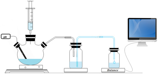 A schematic of the methanolysis reaction is shown in Figure 10. This reaction was designed to measure the volume of hydrogen produced. In this setup, 10 mL of methanol, 0.25 g of NaBH4, and 0.025 g of the catalyst were placed in a three-neck round-bottom flask. This flask has three openings: one for pH measurement, the second for adding methanol, and the third for emitting hydrogen connected to a pipe. The catalyst and NaBH4 come into contact with the methanol to initiate the hydrogen generation reaction. The volume of hydrogen produced was vented into a bottle filled with water to increase the pressure. Owing to the increase in pressure, an equivalent volume of water was transferred to another bottle placed on an electronic balance. The volume of hydrogen generated can be determined by measuring the mass of water obtained. All values were recorded and analyzed over time using computer software (Origin 2024 (10.1)). At the end of the hydrolysis reaction, the catalyst was separated from the reaction mixture and regenerated by washing three to four times with methanol, followed by drying for 9 h at 90 °C in a drying oven. The regenerated catalyst was subsequently utilized in hydrolysis reactions.