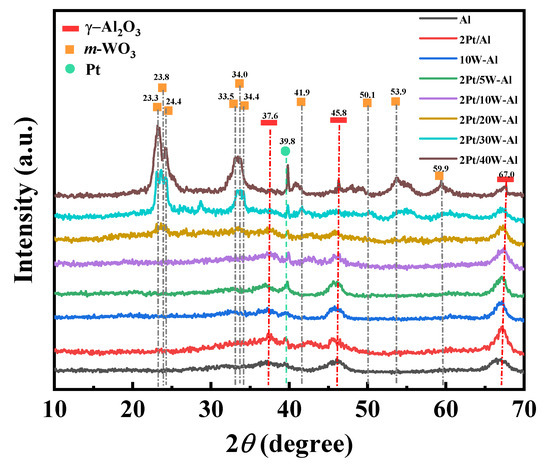 The X-ray powder diffraction (XRD) patterns of the Al2O3 support and all of the 2Pt/xW–Al samples (representing 2 wt% Pt–x wt% W) are presented in Figure 1. Diffraction peaks corresponding to crystalline γ-alumina were observed at 37.6, 45.8, and 67.0° for all of the tested samples. It is important to note that no tungsten oxide species were observed when the W loading was less than 10 wt%, likely due to the ultra-dispersion of tungsten species. Further increasing the W loading resulted in the appearance of characteristic diffraction peaks of monoclinic WO3 (m-WO3) at 23, 33, 42, 50, 54, and 60° [25]. This suggests that a monolayer distribution of polytungstate species is achieved when the W loading reaches 10 wt%. Even with relatively high Pt loadings for all of the 2Pt/xW–Al samples, Pt was hardly observed by XRD, as the diffraction peaks of highly dispersed Pt were partially obscured by the signals from γ-Al2O3. Characteristic metallic Pt diffraction peaks with increasing intensity and a narrowing half-peak width were observed when further increasing the W loading to 40 wt%, indicating an increasing particle size. The Pt crystallite size in 2Pt/40W–Al was estimated as ~7 nm using Scherrer’s formula. This observation confirms that overloading W species can have a negative influence on the dispersion of Pt. Therefore, maintaining an appropriate level of W species is crucial to ensure well-dispersed Pt nanoparticles.