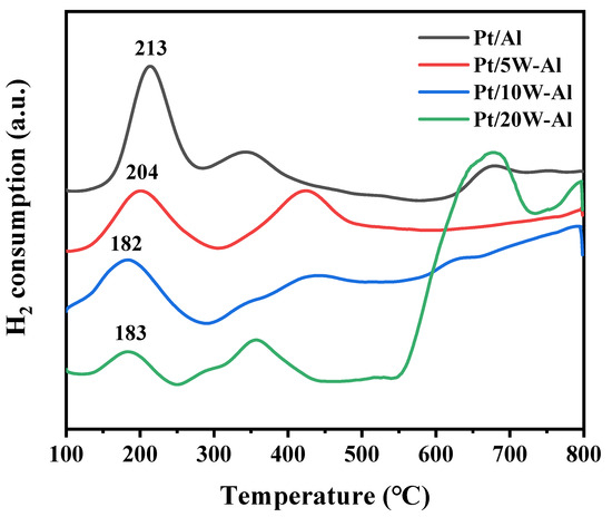 Figure 4 depicts the hydrogen temperature programmed reduction (H2-TPR) profiles of the Pt-based catalyst precursors used to assess the influence of tungsten (W) content on the reducibility of Pt and WOx species. In the trace of the 2Pt/Al precursor, a peak at 213 °C is attributed to the strong interaction between Pt species and γ-Al2O3. Upon modifying γ-Al2O3 with W, the reduction peak shifted to a lower temperature, indicating the decreased strength of the interaction between Pt species and WO3 compared to that between Pt species and Al2O3. For the 2Pt/5W-Al and 2Pt/10W-Al precursors, the reduction peaks decreased to 204 °C and 182 °C, respectively. Interestingly, with a further increase in the W loading, the 2Pt/20W-Al precursor exhibited a similar H2-TPR profile to that of the 2Pt/10W-Al precursor. This observation indicates that the W loading plays a critical role in determining the strength of the interaction between Pt species and the support. It further confirms that a monolayer distribution of polytungstate species on γ-alumina can be achieved when the W loading reaches 10 wt%. Additionally, two small reduction peaks at 450 °C and 650 °C are attributed to the low-polymerized (WOx)n species. In the H2-TPR profiles of 2Pt/5W-Al and 2Pt/10W-Al, a broad peak emerging in the higher temperature range (260–500 °C) can be ascribed to the reduction of WO3 crystallites (WO3 → WOx). Meanwhile, in the H2-TPR profile of 2Pt/20W-Al, the main peak within the range of 550–750 °C is a result of the reduction of WO2.9 → WO2 (590–720 °C), primarily resulting from the abundant presence of crystalline WO3 in 2Pt/20W-Al [26]. This observation aligns with the XRD results.
