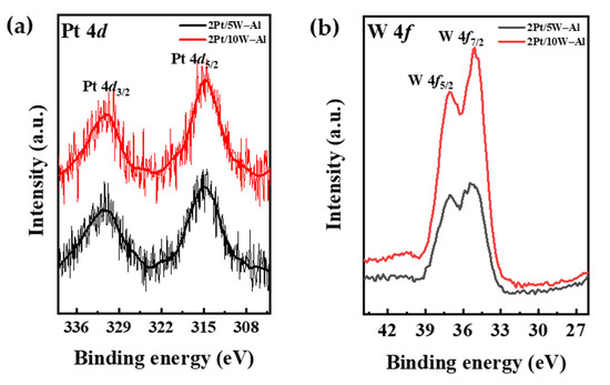 The surface electronic state of the prepared catalysts was investigated using X-ray photoelectron spectroscopy (XPS). The Pt 4d core level peaks were chosen for analysis of the electronic state of Pt species, as the Pt 4f core level is overlapped by W 5s and Al 2p signals [23,25]. Figure 5 presents the Pt 4d and W 4f XPS spectra of the samples. The Pt 4d core level spectra (Figure 5a) reveal that in both 2Pt/5W–Al and 2Pt/10W–Al samples, almost all Pt species exist in the metallic state. This is indicated by the binding energies (BEs) of the Pt 4d5/2 and Pt 4d3/2 core levels, located at approximately 315 and 331 eV, respectively. The W 4f region (Figure 5b) of the W-modified 2Pt/xW–Al samples shows two distinct peaks, centered around 33–36 and 36–39 eV, corresponding to the W 4f7/2 and W 4f5/2 core levels, respectively. These peaks are attributed to oxidized tungsten species, specifically W6+ and W5+ [23]. The presence of W5+ is likely due to the partial reduction of WO3 by spillover hydrogen atoms originating from the Pt surface. The BE of W 4f shifts from 35.9 eV to 34.5 eV and from 37.5 eV to 36.8 eV, which might be caused by the electronic transfer to W6+ and to W5+. Consequently, there truly exists an interaction between tungsten species and platinum [25]. The integration of the XPS peak area of the Al 2p (Figure S6), Pt 4f (Figure 5a), and W 4f (Figure 5b) orbitals for the Pt/5W-Al and Pt/10W-Al catalysts distinctly indicates that the Pt/Al ratio remains approximately constant at around 0.35 for both catalysts (Table S1), even when the W content increases from 5% to 10%. However, the Pt/W ratio decreases from 1.05 to 0.55, which is consistent with the increase in W content. The optimal W/Al ratio is 0.65, with a corresponding Pt/Al ratio of 0.35. At this point, the (Pt+W)/Al ratio reaches 1, suggesting that Pt and W form a single monolayer on the γ-Al2O3 surface.