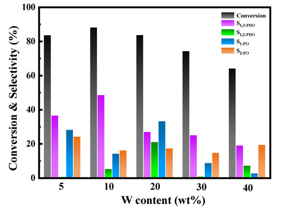 To obtain the more valuable 1,3-PDO, selective C–O bond cleavage of the secondary hydroxyl group in glycerol is crucial. Generally, the most effective catalysts for glycerol hydrogenolysis to 1,3-PDO consist of a noble metal, which serves as the active site for hydrogen activation, and an oxophilic promoter, which selectively activates the secondary hydroxyl group [11]. Pt, Ir, and Rh are commonly employed in the preparation of metal–acid bifunctional catalysts for the selective hydrogenolysis of glycerol to 1,3-PDO, owing to their exceptional ability to activate hydrogen [12]. Additionally, WOx and ReOx have been proven to be highly effective promoters for noble metal catalysts in this reaction [11]. Systematic studies on the effect of ReOx on Rh [18] and Ir [19] catalysts were conducted by Dumesic and Tomishige’s groups. While Ir–ReOx catalysts achieved a high 1,3-PDO yield (38%) at 120 °C and 80 bar in the presence of a small amount of H2SO4 as an additive, the stability of this catalysis system was compromised by Re leaching due to the high solubility of ReOx in water [20]. Recently, Pt–WOx-based catalysts have garnered enormous interest due to their lower cost compared to Ir-containing catalysts and their enhanced higher durability compared to ReOx-promoted catalysts stemming from the insolubility of WOx in water. The interaction between the Pt active center and the tungsten oxide promoter has been identified as having a significant impact on the performance of glycerol hydrogenolysis. However, tungsten oxides typically exhibit low surface areas, rendering them unsuitable as supports. Despite using mesoporous tungsten trioxide as the support for Pt, only 39.2% selectivity toward 1,3-PDO was achieved at 18.0% glycerol conversion [21]. Several studies have confirmed that the performance of Pt–WOx-based catalysts in glycerol hydrogenolysis is strongly influenced by the type of support used [22,23,24]. Among the supports tested, Al2O3 has demonstrated the most effective performance in the selective conversion of glycerol to 1,3-PDO. During catalyst preparation, tungsten oxide is typically first supported on the chosen support material via impregnation, followed by impregnation of the Pt precursor. Given this, we anticipate that the content of tungsten oxide will play a significant role in glycerol hydrogenolysis to 1,3-PDO over Pt/WO3–Al2O3 catalysts. However, a detailed mechanistic study of the effects of tungsten oxide content on this reaction is lacking, which could provide valuable insights for the rational design of more effective catalysts.