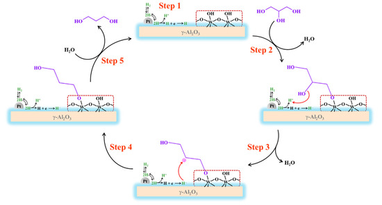 Based on the aforementioned experimental results and investigations in the literature [24,25,26,27,28], a possible mechanism for the selective hydrogenolysis of glycerol to 1,3-PDO over Pt/WOx–Al2O3 catalysts can be preliminarily established (Scheme 1). The initial step in this reaction entails the heterolytic cleavage of hydrogen molecules on the Pt surface, producing protons and hydride ions (Scheme 1, Step 1). Qin et al. [26] have shown that hydrogen undergoes initial homolytic cleavage on the Pt active site, resulting in the formation of hydrogen atoms. These atoms can then spill over onto the surface of WO3. At this point, one hydrogen atom can donate an electron to a W6+ ion, generating a proton and reducing the tungsten to W5+. Concurrently, the second hydrogen atom acquires an electron, forming a hydride ion. Simultaneously, glycerol adsorbs onto the catalyst surface via dehydration between its terminal hydroxyl group and a W–OH group. This reaction forms an alkoxide species, specifically the 2,3-dihydroxypropoxide ion (Scheme 1, Step 2). This adsorption configuration, which minimizes steric repulsion, has been corroborated by multiple research groups [26,32,33]. Next, the exposed secondary hydroxyl group of the adsorbed alkoxide is protonated by the H+ generated from the spillover. This is followed by water elimination, resulting in the formation of a secondary carbocation (Scheme 1, Step 3). The adsorbed carbocation is subsequently attacked by the H− ion generated from the previously mentioned heterolytic cleavage of molecular hydrogen, yielding a 3-dihydroxypropoxide ion (Scheme 1, Step 4). Finally, further hydrolysis of the 3-dihydroxypropoxide ion yields 1,3-PDO and regenerates the active center, completing the catalytic cycle (Scheme 1, Step 5). The proposed mechanism attributes the superior catalytic performances of the 2Pt/10W–Al catalyst in the selective hydrogenolysis of glycerol to 1,3-PDO to the optimal amount of W promoter. At a W content of 10 wt%, a monolayer distribution of the W promoter is achieved, leading to an abundance of polytungstate species and a closer proximity between the Pt and WOx active centers. It is well documented that polytungstate species facilitate the stabilization of the secondary carbocation intermediate by delocalizing the negative charge [26]. Furthermore, the close proximity between Pt and WOx promotes rapid hydrogenation of the secondary carbocation [26]. The stabilization and rapid hydrogenation of the secondary carbocation intermediate are crucial for the formation of 1,3-PDO. This is because the desorption of the secondary carbocation prior to the hydride attack is inhibited, thereby preventing degradation reactions.