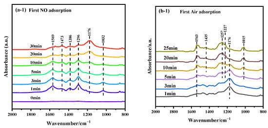 As shown in Figure 8b and Figure S1, the NO adsorption spectra following hydrogen and air treatments exhibit similar trends. After air pretreatment, the Pt nanoparticles on the catalyst are oxidized to higher oxidation states, such as Pt2+ or Pt4+, resulting in weaker CO adsorption by the oxidized Pt species. This weaker adsorption is typically indicated by higher-frequency vibrational modes. Additionally, air pretreatment creates oxygen vacancies on the surface of CeO2, which serve as active sites and influence the CO adsorption behavior. Following air treatment, the intensity of the band attributed to NO2 increases, which may be associated with the rise in surface-adsorbed oxygen. Notably, after H2 treatment, the bands at 1539 and 1369 cm−1 weaken or disappear, while the band attributed to linear nitrite (1450 cm−1) intensifies significantly. The H2 reduction treatment increases oxygen vacancies on the catalyst surface and enhances surface reducibility, potentially leading to the reduction or conversion of nitrate species to nitrite (NO2−).