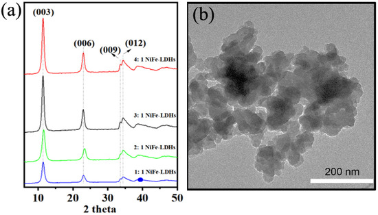 (a) XRD patterns of NiFe-LDHs; (b) TEM image of the 3: 1 NiFe-LDHs.