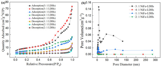 The N2 adsorption–desorption isotherms provide valuable insights into the pore structure characteristics and specific surface area of the LDHs. The N2 adsorption–desorption isotherms of the four NiFe-LDHs samples are shown in Figure 3. For the 3:1 NiFe-LDHs sample, hysteresis loops appear in the region of P/P0 > 0.45, while there is almost no N2 adsorption in the region of P/P0 < 0.4, indicating that the pore structure of the 3:1 NiFe-LDHs is formed by the stacking of some sheet-like materials. According to the classification standards of the International Union of Pure and Applied Chemistry (IUPAC), the pore structure of the 3:1 NiFe-LDHs corresponds to a BDDT (Brunauer–Deming–Deming–Teller) type IV adsorption–desorption isotherm. This type of porous material is characterized by a three-dimensional interconnected porous geometry with high adsorption energy. The hysteresis loop of the 3:1 NiFe-LDHs shows a steep adsorption branch in the high P/P0 region which can be classified as H3 type. The combination of the BDDT type IV isotherm and H3 hysteresis loop indicates that the pore structure of the 3:1 NiFe-LDHs resembles an open slit-shaped capillary structure with parallel external walls or wide cavities and narrow openings. In contrast, other LDH samples with different ratios exhibit weaker N2 adsorption and no significant hysteresis loops, which corresponds to a type III adsorption–desorption isotherm. The BET specific surface area, pore volume, and average pore diameter of the samples are listed in Table 1. The BET specific surface area of the 3:1 NiFe-LDHs is 21.82 m2/g, while the specific surface areas of the other LDH ratios are relatively small. Thus, the N2 adsorption on the external surfaces of the smaller LDHs sheets with other ratios is negligible, and the adsorption primarily occurs at the sample edges, but the absolute amount of edge adsorption remains low. Therefore, compared to the rough and porous surface of the 3:1 NiFe-LDHs, the edge adsorption contributes insignificantly to the total N2 adsorption.