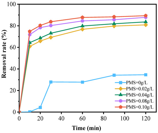 The results shown in Figure 4 indicate that the degradation rate of doxycycline hydrochloride was only 34.63% when the NiFe-LDHs catalyst was added to the reaction system without peroxymonosulfate (PMS). However, increasing the PMS concentration to 0.1 g/L led to a significant increase in the degradation rate, rising to 89.39%. This demonstrates that PMS plays a crucial role in the degradation process. The catalyst facilitates the activation and decomposition of PMS, generating sulfate radicals (SO4−·) that effectively degrade doxycycline hydrochloride. These radicals exhibit strong oxidizing properties comparable to or even exceeding those of highly reactive hydroxyl radicals. A large number of studies have shown that the amount of PMS is an important parameter [29,35,36]. These studies indicate that this parameter significantly affects the ability of SO4−·to oxidatively degrade organic pollutants [35]. Within a certain range, increasing the PMS concentration enhances the pollutant removal efficiency of the system. When the PMS concentration exceeds the optimal level, excess PMS can react with and consume some of the generated sulfate radicals, thereby diminishing the oxidative degradation effect on organic matter. Moreover, other organic substances present in the wastewater may compete with doxycycline hydrochloride for the oxidant, leading to inefficient use of raw materials [37]. In this experiment, as illustrated in Figure 4, the degradation rate of doxycycline hydrochloride increased with higher PMS concentrations, with the curve showing a sharp rise followed by a plateau. Although the optimal PMS concentration has not been definitively determined, considering factors such as energy consumption, cost, and removal efficiency, a concentration of 0.08 g/L is suggested as the optimal amount for this experiment.