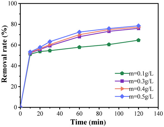 Figure 5 demonstrates that, during the initial 10 min, the degradation efficiency of doxycycline with varying catalyst amounts was relatively modest, with all conditions achieving a degradation rate exceeding 50%. However, as the reaction progressed, a positive correlation between catalyst dosage and degradation efficiency became evident, particularly within the catalyst concentration range of 0.1 to 0.5 g/L, where significant differences in degradation rates were noted. When the catalyst dosage was increased to 0.5 g/L, the degradation rate continued to improve with increasing catalyst concentration, although the rate of enhancement gradually diminished. For example, at a catalyst concentration of 0.5 g/L, the degradation rate reached 78.55% within 120 min. Nonetheless, this increase in degradation efficiency is not economically justified, as the improvement is marginal compared to the results obtained with 0.3 g/L of catalyst. Therefore, based on the experimental findings, the optimal catalyst dosage is determined to be 0.3 g/L.