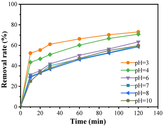 Figure 6 illustrates that, at a catalyst concentration of 0.3 g/L and a PMS concentration of 0.08 g/L, the curves corresponding to pH values of 3 and 4 show relatively high removal rates. Notably, the degradation of doxycycline is most efficient at a solution pH of 3, achieving a degradation rate of 73.1%. At pH 4, the degradation rate is slightly lower, reaching 72.5%. As the pH increases, the degradation rate gradually declines, stabilizing at a pH of 10 with no significant further changes. This indicates that pH is a critical factor influencing the generation of dominant free radicals in advanced oxidation processes. Different pH levels affect whether the sulfate radicals (SO4·−) produced by the activation of peroxymonosulfate (PMS) react with water (H2O) or hydroxide ions (OH−), leading to the formation of a more potent oxidative system. When the pH is below 7, SO4·− is the predominant active oxidizing species; above pH 7, ·OH become the primary active species. However, under strongly acidic or alkaline conditions, the oxidative power of SO4·− generated by PMS can surpass that of ·OH, resulting in effective degradation of doxycycline under both extreme conditions. Nevertheless, in practical applications, the use of strong acids or bases poses challenges due to the potential corrosion of equipment and the stringent requirements for the operating environment. As such, the feasibility of enhancing the catalytic effect by maintaining strong acidic or alkaline conditions is limited. Therefore, a neutral pH may be preferred in practical operations, depending on the specific circumstances.