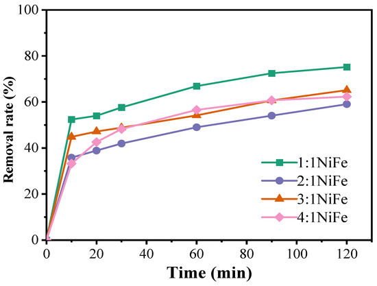 Figure 7 demonstrates that, under identical mass conditions, the 1:1 NiFe-LDH catalyst exhibits the highest degradation performance, characterized by a generally upward trend in the degradation curve. However, the rate of increase diminishes after 120 min, at which point the degradation rate of doxycycline hydrochloride reaches 75.17%. The 3:1 NiFe-LDH catalyst follows, achieving a degradation rate of 62.32%, while the 4:1 and 2:1 NiFe-LDH catalysts show comparatively lower effectiveness. In the NiFe-LDH materials, both nickel and iron are transition metals with variable oxidation states, organized in a specific spatial configuration. Table 2 summarizes the experimental conditions and degradation efficiencies for the activation of PMS by various catalysts in the degradation of tetracycline-class antibiotics, providing valuable comparative data. In this study, NiFe-LDHs demonstrated superior pollutant removal capabilities, with the 1:1 Ni-Fe ratio proving particularly competitive. Moreover, the concentration of PMS and the pH value significantly influenced degradation efficiency, with NiFe-LDHs exhibiting enhanced stability and activity at neutral pH.